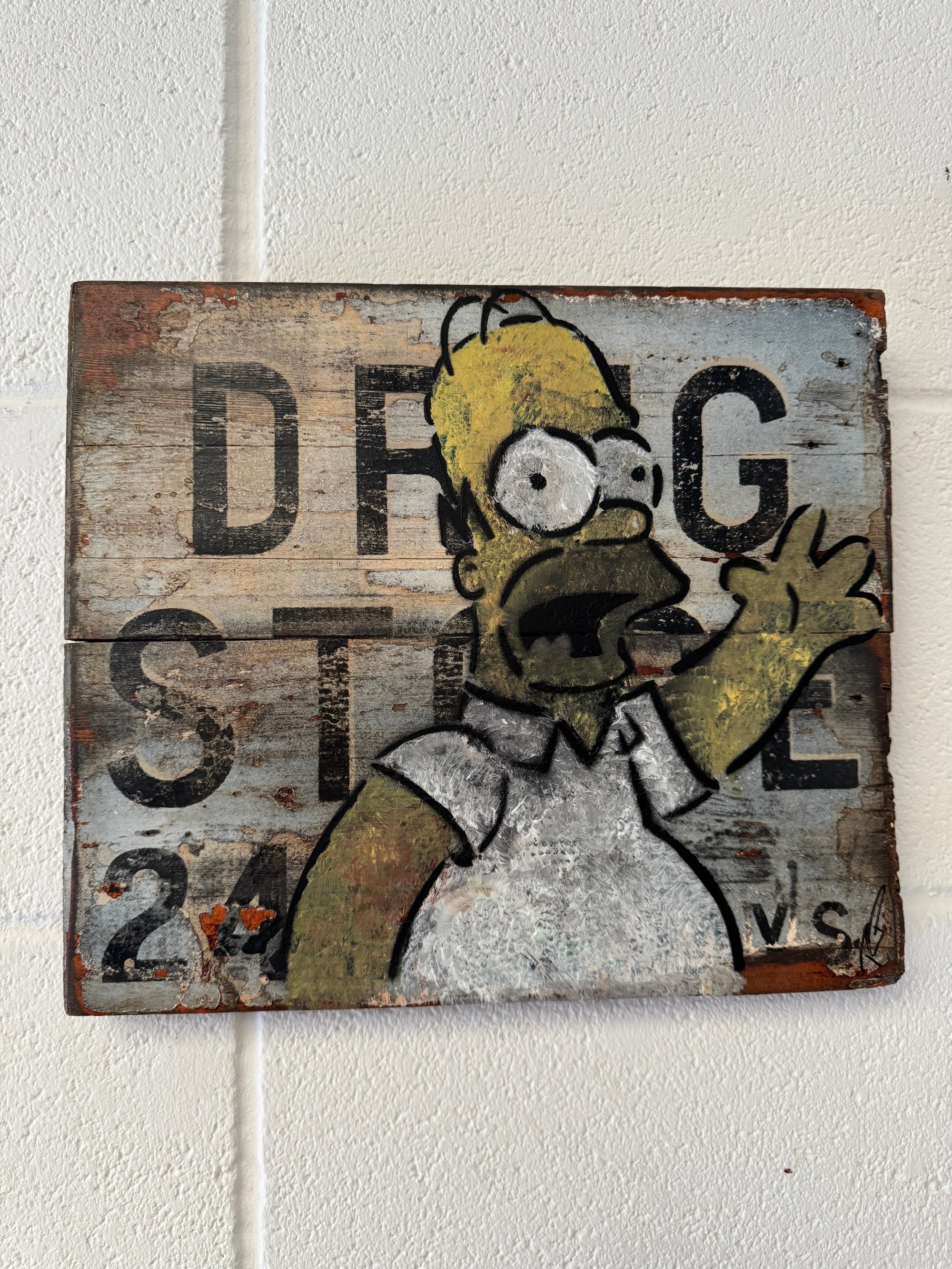 Homer Simpson painted onto a vintage drug store sign. 15inx11in