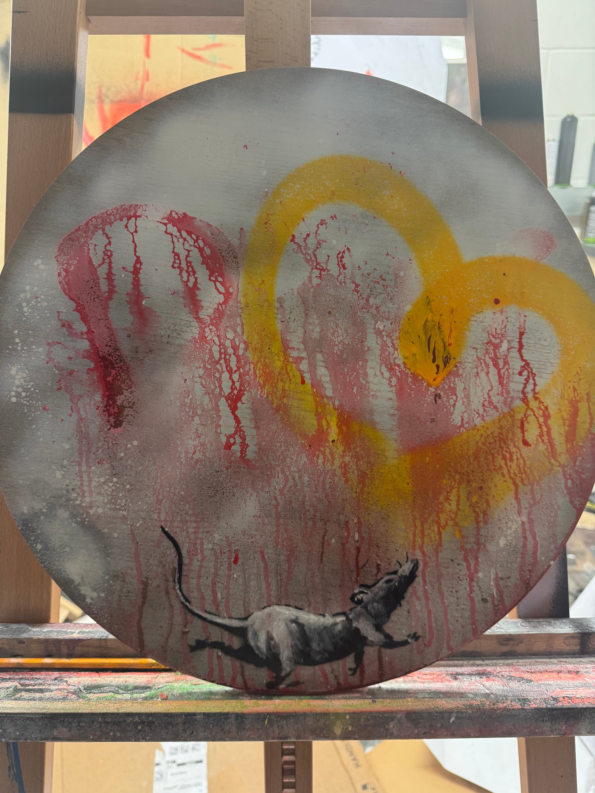 Spray painted onto a round table top from Robs studio. 17in